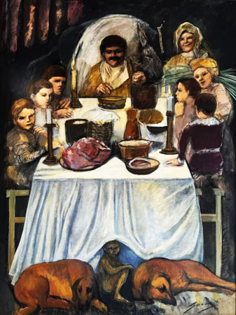 código.23. La Cena del Gobernador; pieza expuesta en el Museo de Arte Contemporáneo de Caracas, en la muestra Nuestro Señor Don Quijote, óleo sobre lienzo, 200x150 cms, año 1992, w0034 |