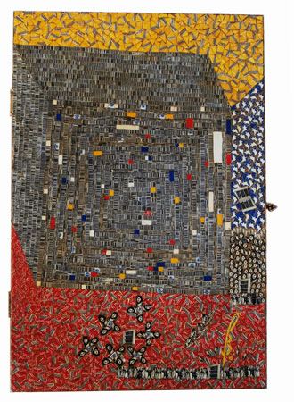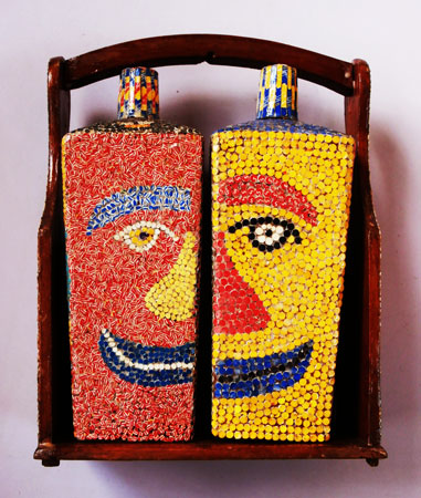 código.1, Estante dos botellas y 16 rostros, mobiliario, talla madera y ensamblaje Mosaico plástico, 34x27x12 cms  |