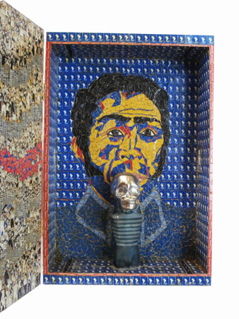 código.2. ADN de un Rostro, mobiliario, figura metálica y ensamblaje Mosaico plástico, 52,5x35x11.5 cms  |