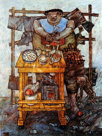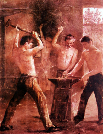 código.5. DOS OBREROS, acrílico sobre lienzo, 50x60 cms, año 1981 |