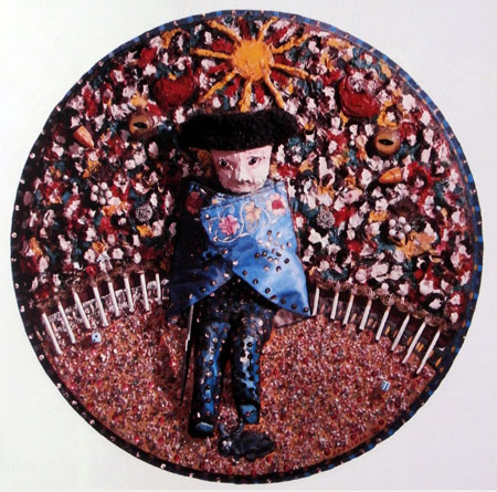 AZUL Y ORO, óleo y materiales diversos sobre madera, 51 cms diámetro, año 1976 |